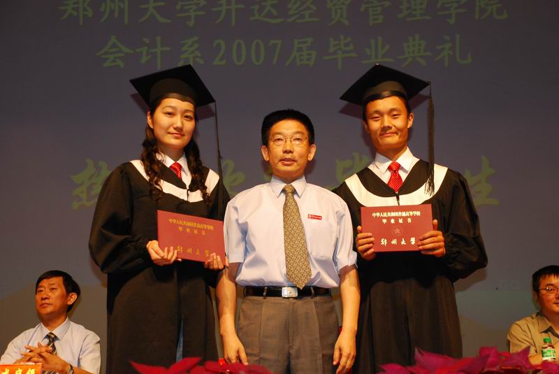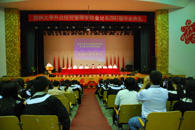 2007年6月8日上午,郑州大学升达经贸管理学院会计系07届毕业典礼在思源会馆隆重举行。典礼由会计系党总支朱建良书记主持。创办人代表王育文博士,升达经贸管理学院院长崔慕岳,院党委常务副书记戎庭银同志,郑州大学党委学工部部长、学生处处长戴国立,驻校董事王淑芳女士,副院长张平之教授、赵亚宏副教授、张洁女士,会计系主任方正生教授等领导及各部门主管出席了这次典礼。