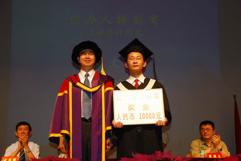 典礼上崔院长亲自为毕业生代表颁发毕业证书并扶正流苏。还代表学院接受了会计系毕业生赠与母校的纪念品。