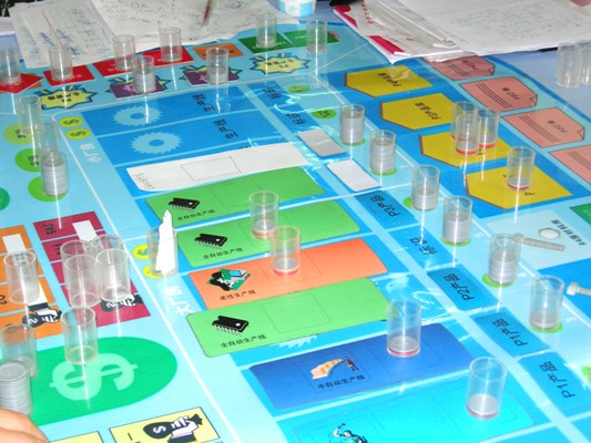 完成了第3年的模拟经营,拿到第四年的市场订单后,第一天的比赛在一片紧张的气氛中暂告一段落,一些队伍为自己抢到市场大单而兴奋,一些队伍因资金紧缩而困扰,大部分队伍的资金吃紧,参赛队员围在盘面上讨论第二天比赛的战略,久久不肯离去。