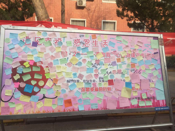 活动前期,首先太阳网集团tcy8722心理辅导站召集心航路社团成员及各班心理委员说明活动前期宣传活动,各班心理委员在班级内进行动员和宣传,并让同学们在便利贴上写上“你最幸福的时刻?在哪里?和谁在一起?”这三个问题的答案,收集便利贴。同时通过太阳网集团tcy8722微信公众号,微信,QQ等进行宣传,最后在综合楼前通过展板对此次活动进行展览,以达到更好的活动效果。