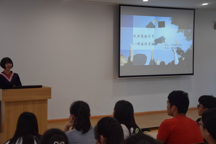 交流会在主持人的简单介绍下拉开了序幕,此次的交流会演讲人分别是就职于河南省组织建筑设计院有限公司的韩大妞,就职于洛阳银行的李兴照,就职于中国建设银行的穆安琪,就职于渤海银行郑州分行的李蒙恩。他们以诙谐幽默的方式给同学们讲述他们的择业过程中面临的问题和他们一些就业经历,在愉快的氛围中让同学们汲取一些社会经验。