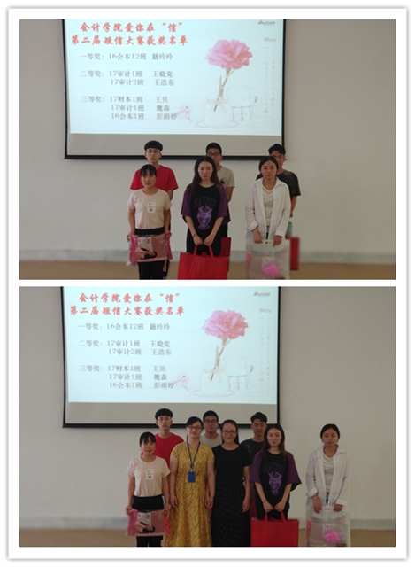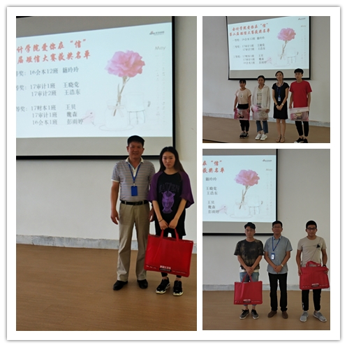 仪式第二项,由张红阳书记、陈刚老师、刘锦老师分别为获得一等奖、二等奖、三等奖的同学颁发荣誉证书。获得一等奖的为:16会本12班 籍玲玲;获得二等奖的为:17审计1班 王晓党,17审计2班 王浩东;获得三等奖的为:17财本1班 王贝,17审计1班 魏森,16会本1班 彭雨婷。