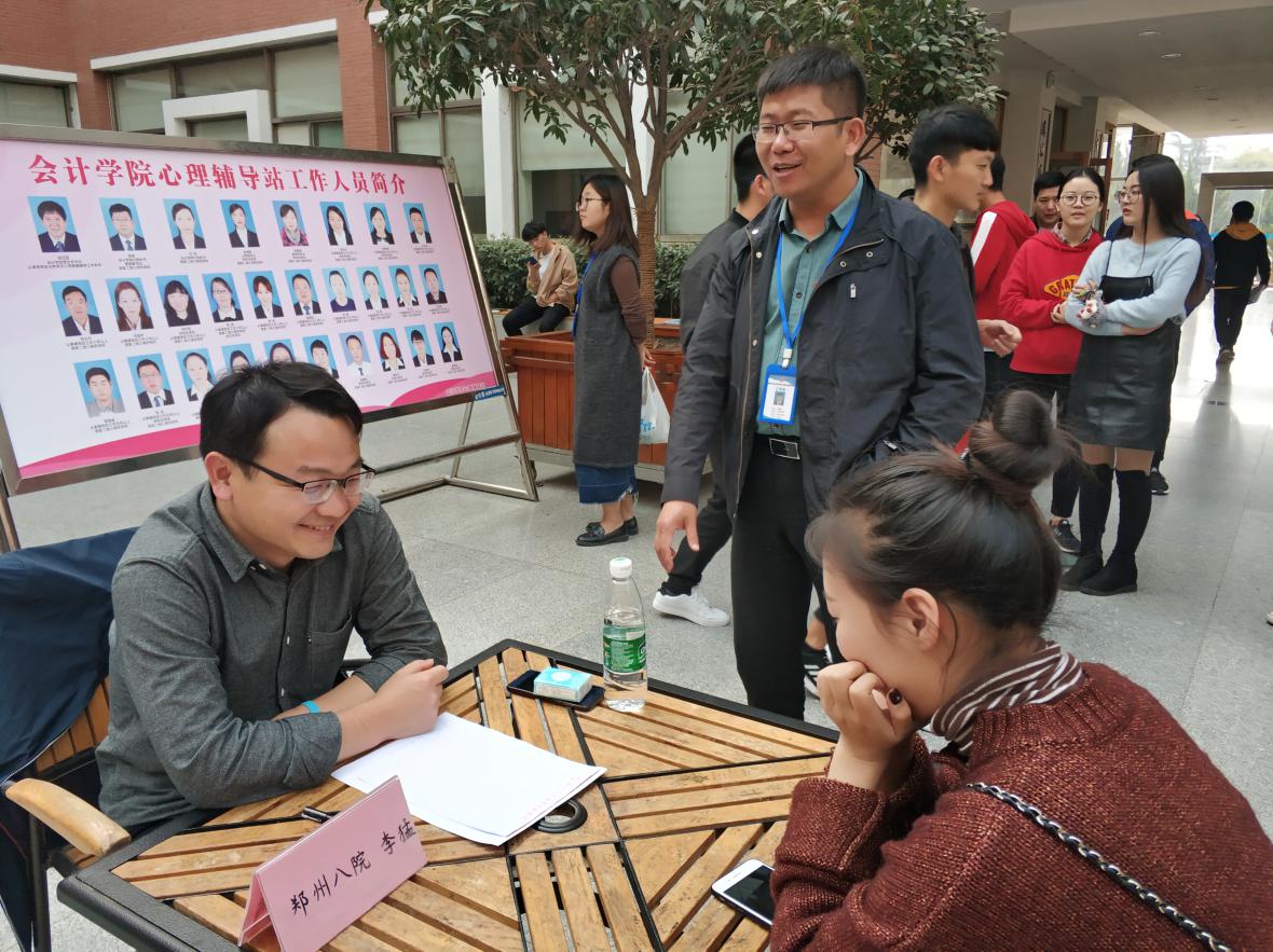 太阳网集团tcy8722对此次活动非常重视,太阳网集团tcy8722行政秘书兼团委书记陈刚老师到现场参加了启动仪式,并与校心理健康教育中心邀请的校外专家,郑州八院的副主任医师李猛认真沟通,细致交流,同时现场学习与学生的心理沟通和交流技巧,以求帮助自己更好的解决本院学生的相关困扰和问题。
