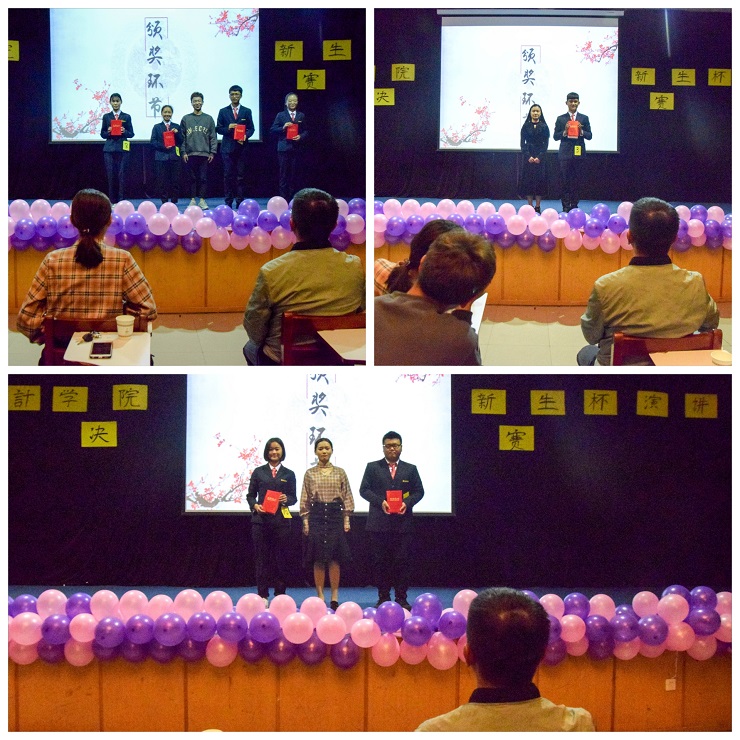 最令人激动的颁奖时刻到了,由主持人宣读参赛选手得分,决赛结果见分晓。最后,学生会副主席刘壮为孙小雪、薄阳、李晓文、秦梦露颁发优秀奖;社联理事长周晨阳为张坤浩、邢义珂、刘云颁发三等奖;学生会主席文静为张晨曜,岳梦梦颁发二等奖;团委副书记徐林林为邱林洲颁发一等奖;太阳网集团tcy8722行政秘书兼团委书记陈刚老师为18级会本6班、18级审计1班、18级审计2班、18级会本2班、18级财本1班颁发道德风尚奖(2个)精神文明奖(2个)最佳组织奖(1个)。