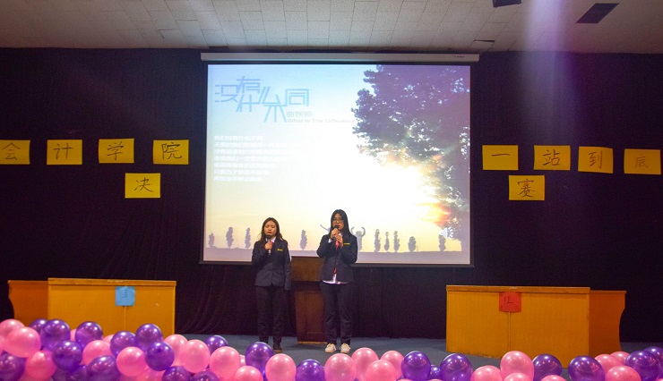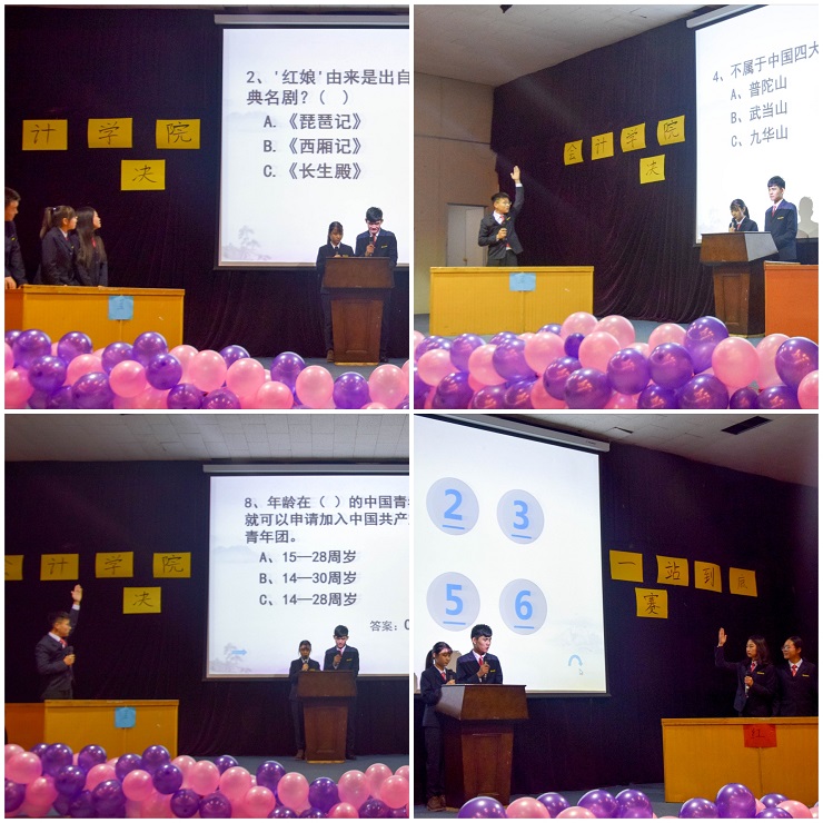 通过层层选拔最终10位同学进入个人决赛,8支队伍进入团体决赛。此次比赛以“中华优秀传统文化”主题为主,其他党团知识为辅,采用一站到底的形势,环节紧凑,趣味盎然。首先,在个人决赛现场,10位选手抽签决定PK对象,每轮两人一组对决,双方选手使劲浑身解数、争分夺秒、毫不示弱,场面紧张而激烈。其次,在团体决赛现场8支队伍,两两对决,再由获胜组四组进行对决,得出决胜组。双方队员你来我往,棋逢对手,选手们时而因错失良机而叹息,时而因团体出色表现而鼓掌欢呼。最后,由生活部王颖和庞晶晶带来歌曲《没有什么不同》缓解白热化的比赛氛围。