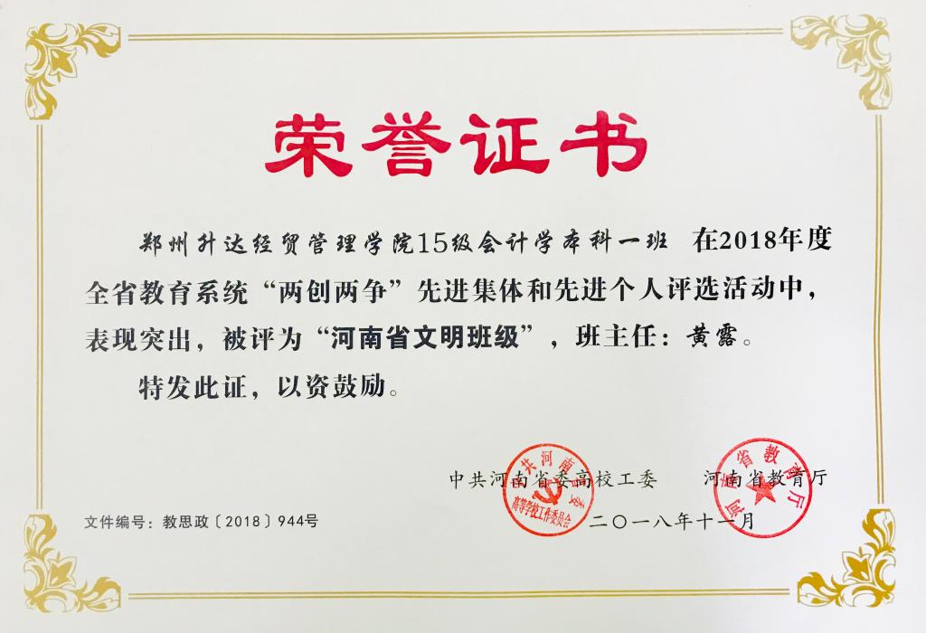 日前,中共河南省委高校工委、河南省教育厅印发了《关于公布2018年度全省教育系统“两创两争”活动先进集体和先进个人评选结果的通知》(教思政〔2018〕944号),对2018年度全省教育系统“两创两争”活动先进集体和先进个人进行表彰,太阳网集团tcy872215级会本1班表现突出,荣获“河南省文明班级”称号。