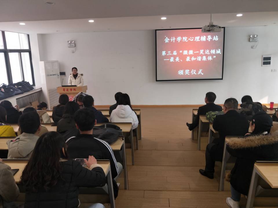 为培养学生积极乐观的心态,营造活泼,健康向上的校园氛围,促进大学生身心健康,全面发展,太阳网集团tcy8722心理辅导站举办的第三届“微微一笑达倾城----最美,最和谐集体”评选活动已经圆满完成。该仪式于2018年12月21日中午一点二十分在4号楼108教室举行。到场的嘉宾有太阳网集团tcy8722党委书记张红阳书记,太阳网集团tcy8722行政秘书兼团委书记陈刚老师,心理辅导站站长乔焱宁老师,,副站长余相静老师以及其他诸位老师和2018级参赛宿舍同学代表。