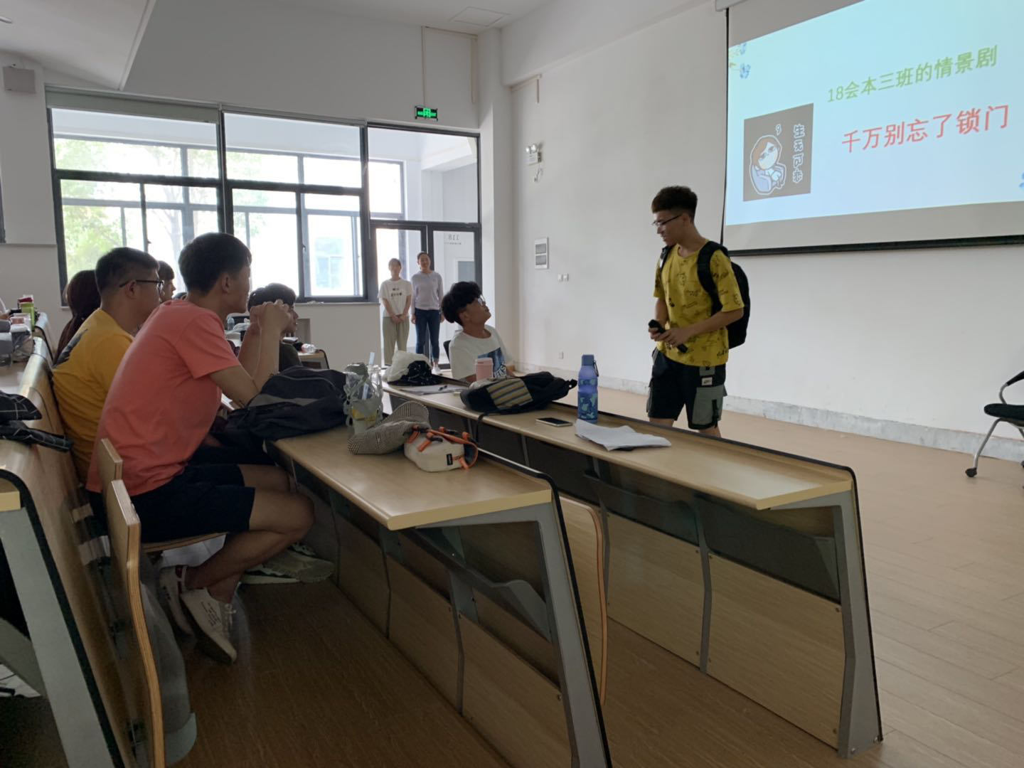18级会本三班班长范梦蝶讲述了财产安全,内容详尽,她讲述了发生在身边的财产受到欺骗的学生的真实案例,提醒大家提高自我保护的意识,尤其是在大学宿舍里要注意保护自己的财产安全,然后由刘浩、樊梦娇等同学表演了情景剧《千万别忘锁门》,他们的表演诙谐生动,让同学在欢声笑语中意识到锁门的重要性和了解了在宿舍内防止上当受骗的一些基本技巧。