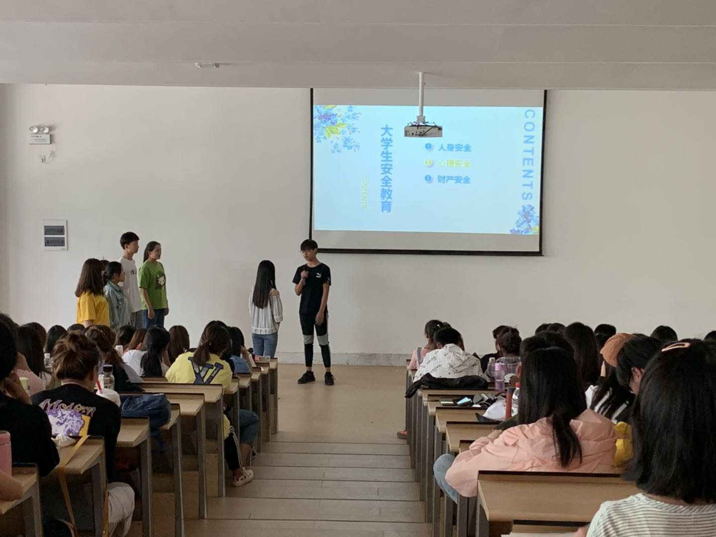 班会开始,同学们秩序井然入场。首先,18级会本九班班长罗璨做了开场导入,引入本次班会主题,然后各班班长分别从不同方面展开安全知识的普及。
