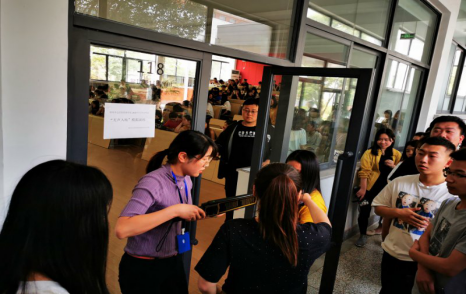 辅导员老师利用金属探测仪对学生的衣服、鞋子等部位进行扫描的同时并告知学生着装的注意事项,对未通过检测的学生告知其存在的问题并告知学生更换自己的着装。