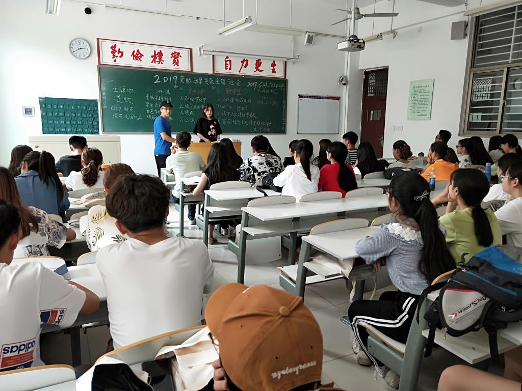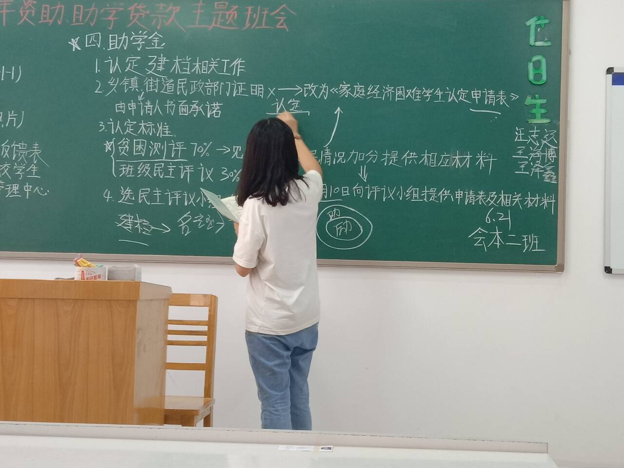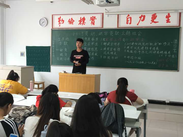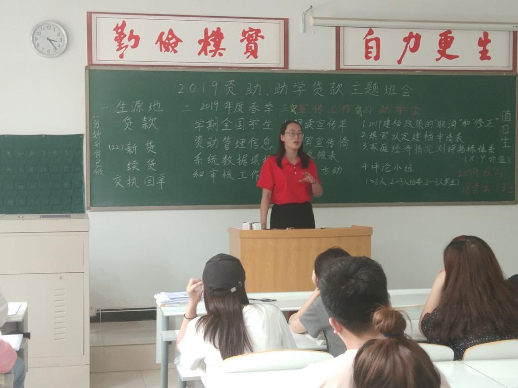 首先,18会本2班的团支书谷茹蕾,根据学校资助中心下发材料要求,将2019年度助学金认定建档工作的注意事项进行总结,并认真得书写在教室黑板上,给同学们详细讲解,建议同学们利用暑假填写申请表和准备好各项证明材料。