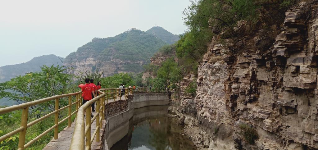 红旗引领,传承红色基因,队员们沿着渠岸向前,脚下每过一段都有林州人民为为保证工程质量而刻下的标识,从1966年至今五十多年,红旗渠依旧矗立在太行山脉之间,依旧为林州人民送去珍贵的水资源。盘绕在山间的红旗渠,像神话传奇一般,站在渠岸,抬头,峭壁高耸;俯首,百米深渊。红旗渠便似林州人民的精神支柱一般,无愧于天地。