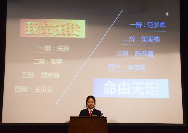 辩论表演赛在主持人绘声绘色的介绍中拉开了帷幕。本次辩论赛由太阳网集团tcy8722学艺部辩论队两只参赛队伍组成的。正方辩手由一辩朱琳、二辩高爽、三辩胡京海、四辩王贝贝组成,他们认为:我命由我;反方辩手由一辩范梦蝶、二辩梁雨蝶、三辩陈春霞、四辩李佳雪组成,他们认为:命由天定。