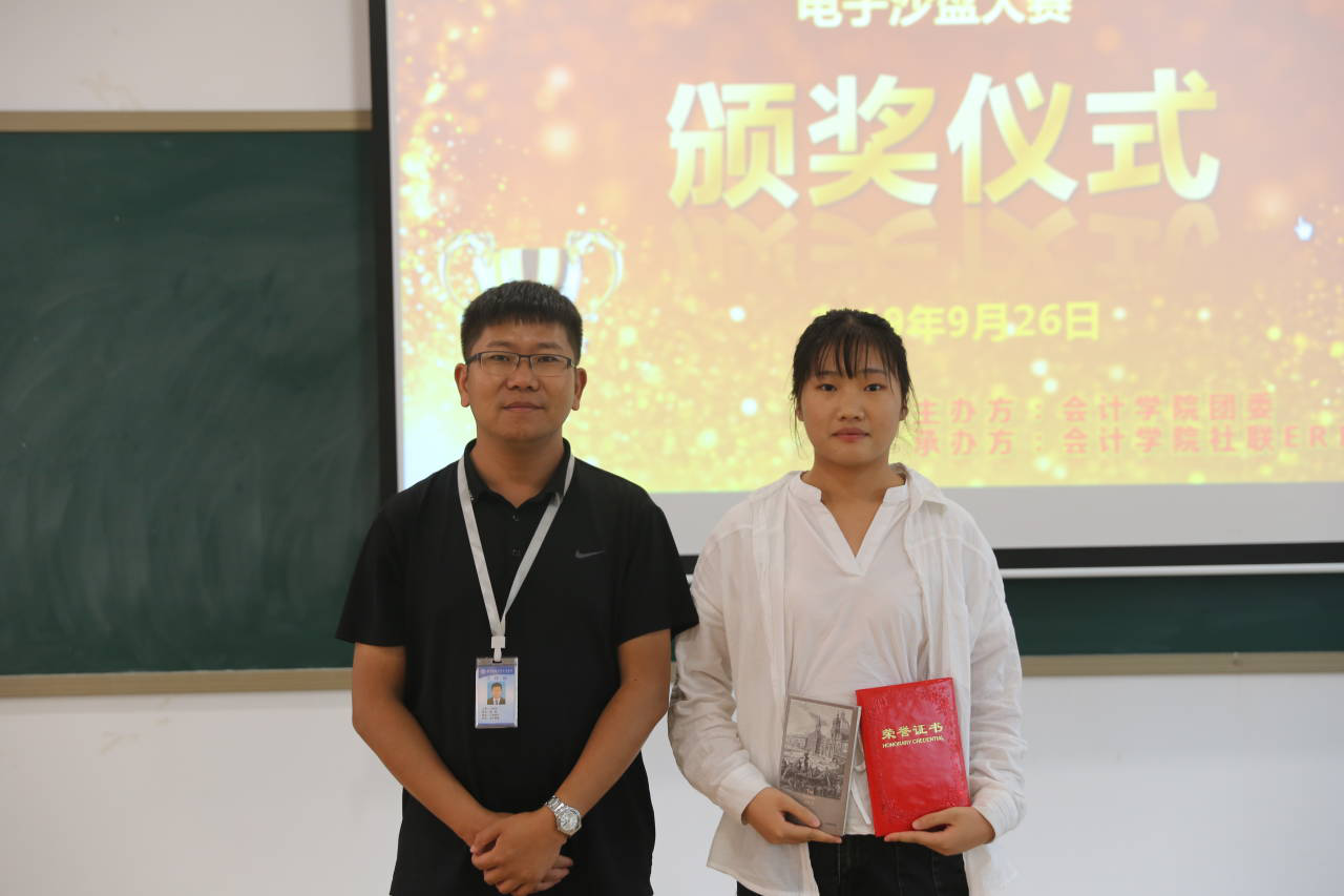 太阳网集团tcy8722ERP沙盘协会指导老师张瑞亚老师为三等奖得主颁奖