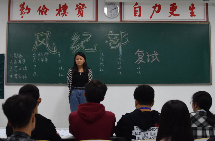 在面试过程中,各部门根据自身工作性质和工作重点提出了适宜的问题来考验同学们的组织能力、处理人际关系能力、沟通能力和创新意识等,面对台下众多的“主考官”,19级同学从容自信,对所提出的问题认真作答,言谈举止中流露出对团学会工作的真挚渴望和敢于表现自我的信心。同学们以演讲等形式展现出了自己最好的一面,并且积极展示出自己的特长,实力难分伯仲。在面试期间,团委副书记巫晓梦、学生会主席梁诗苑、社联理事长姜大川等主席团成员都亲临现场,指导招新面试工作。他们指出:在本次工作中要提高干事素质,注重质量等问题。