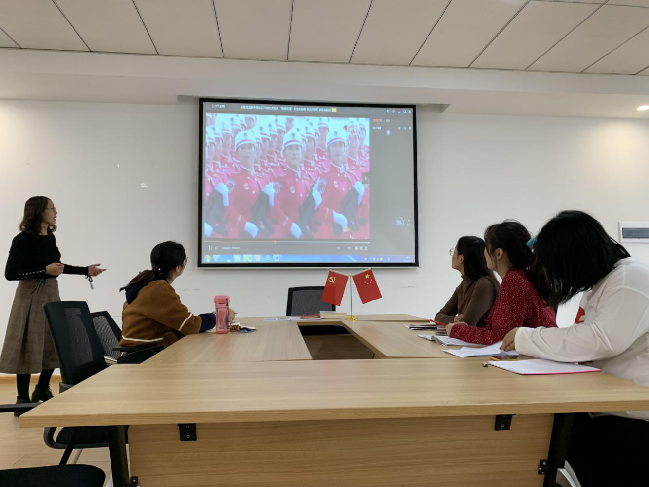 首先,支部书记陈晓同志带领支部成员集中观看盛大的阅兵仪式,引导支部师生党员始终保持奋斗精神和革命精神。