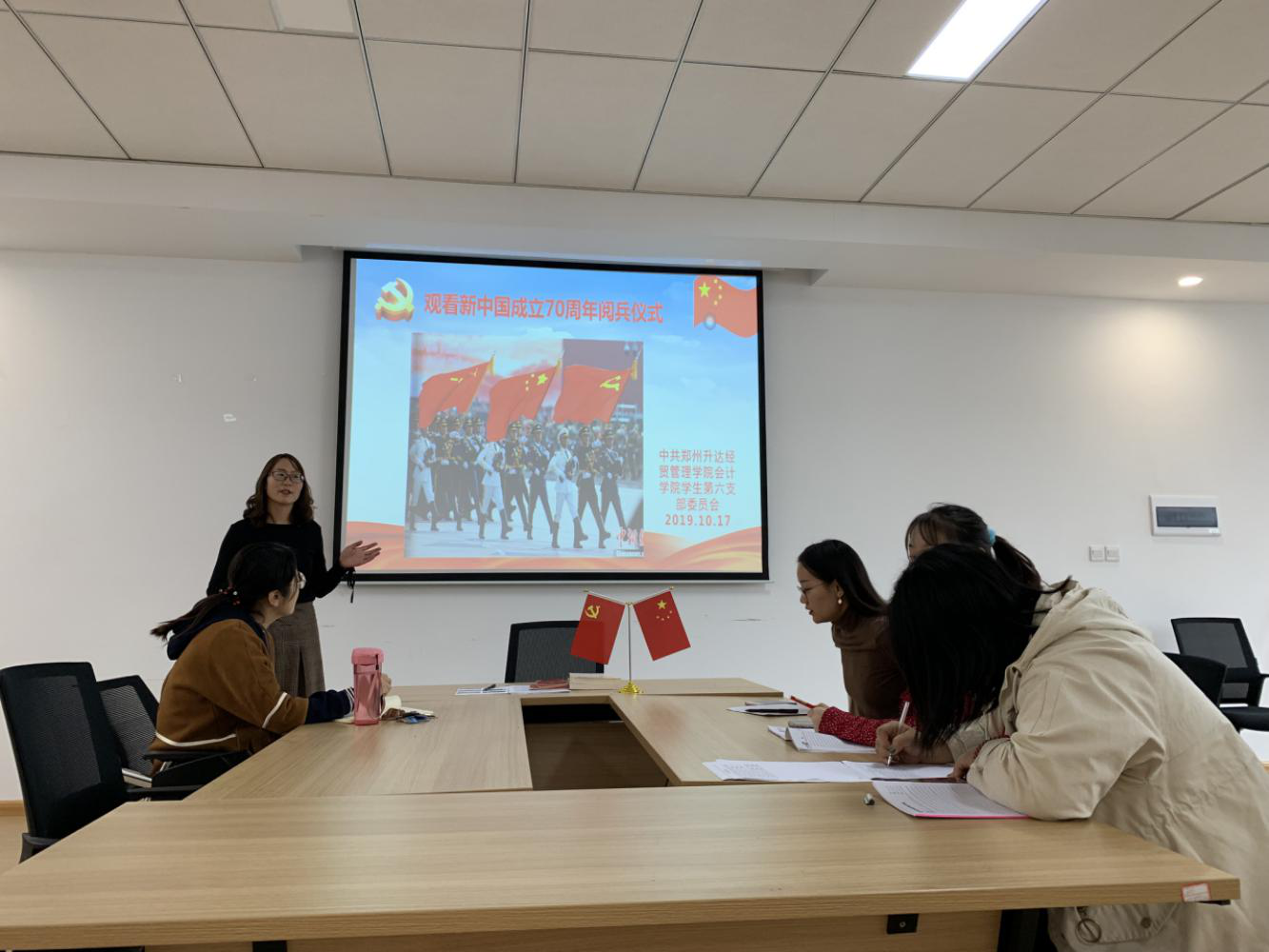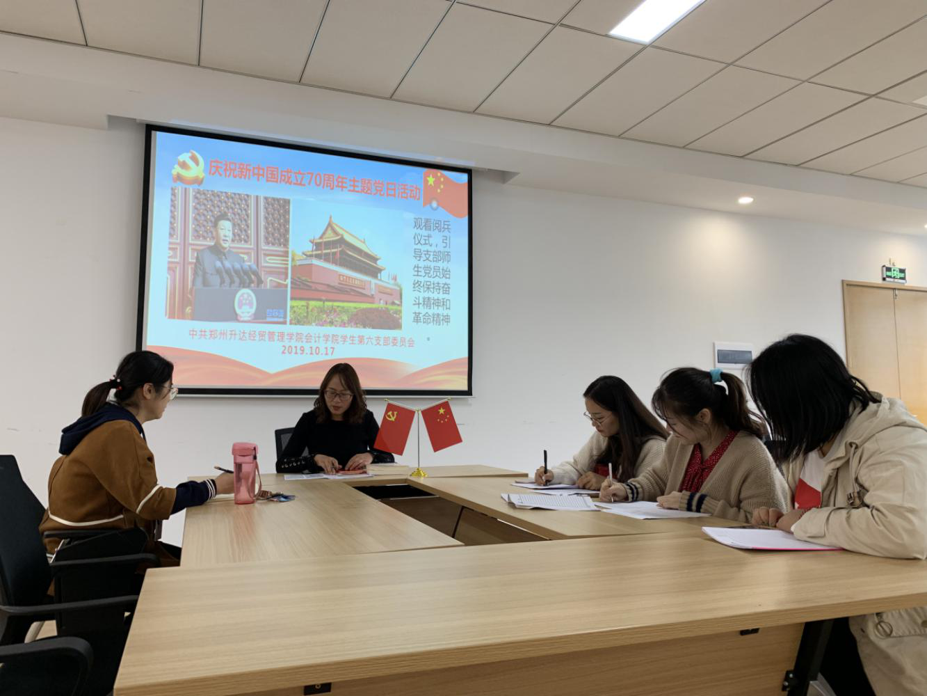 2019年10月15日下午16:10在教学四号楼209会议室,太阳网集团tcy8722学生第六党支部全体师生党员,围绕“庆祝新中国成立70周年”开展主题党日活动,激励支部师生党员不忘初心、牢记使命。