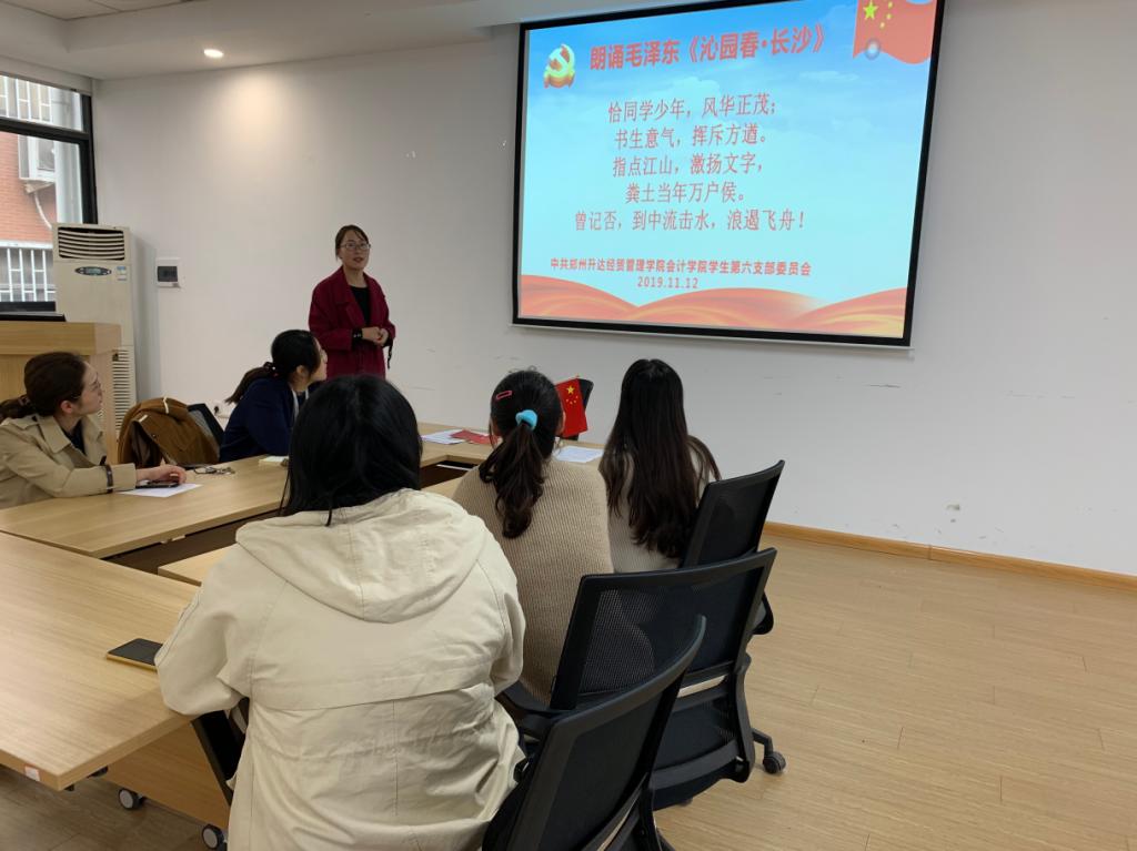 党支部书记陈晓老师,带领大家重温毛泽东诗词《沁园春•长沙》,并且带领党支部师生党员一起朗诵,感受毛主席青年时代的革命斗争生活和作为革命青年对国家命运的感慨;以天下为己任,蔑视反动统治者,改造旧中国的豪情壮志。引导党支部师生党员爱党敬业,立鸿鹄志、求真理学真知,把建设更加美好的国家作为自己的抱负和己任。