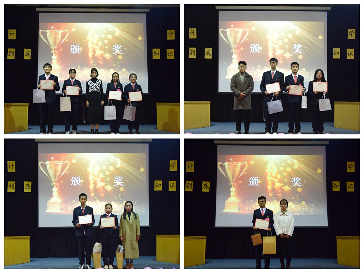 在选手们激烈的比拼后,迎来了激动的颁奖时刻。在个人赛颁奖环节中,由25届学生会副主席张洁为秦臻、孙雨琪、张小玉、张润颁发优秀奖,由25届社团联合会理事长姜大川为张亚奇、房小青、黄先华颁发三等奖,由25届学生会主席梁诗苑为郭铠辛、任丽影颁发二等奖,由25届团委副书记巫晓梦为崔佳龙颁发一等奖。在团体赛颁奖环节中,由19级新生辅导员刘婧老师为19级会本6班颁发优秀奖,由19级年级团总支书记、新生辅导员孟醒老师为19级会本8班颁发季军奖,由太阳网集团tcy8722行政秘书兼团委副书记刘锦老师为19级财管1班颁发亚军奖,由太阳网集团tcy8722行政秘书兼团委书记陈刚老师为19级会本2班颁发冠军奖。