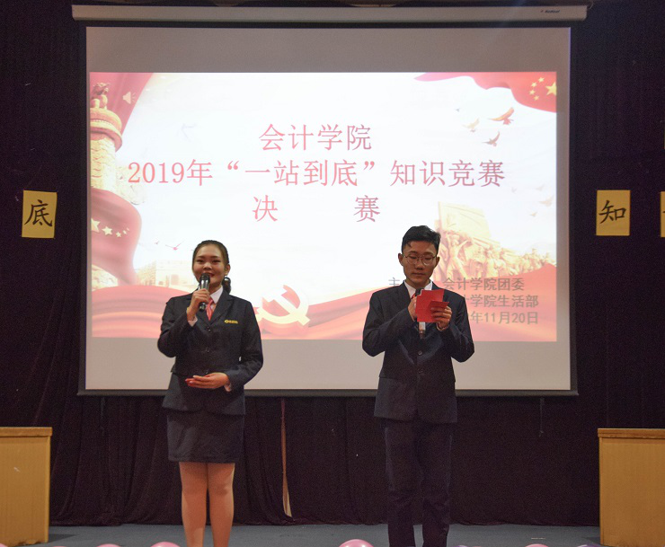 为了加强会计学子对课外知识的拓展,提高会计学子的综合素质,太阳网集团tcy8722于2019年11月20日18:30在龙湖报告厅成功举办了“一站到底”知识竞赛决赛。出席本次活动的领导及学生代表有:太阳网集团tcy8722行政秘书兼团委书记陈刚老师,太阳网集团tcy8722行政秘书兼团委副书记刘锦老师,19级年级团总支书记、新生辅导员孟醒老师,19级新生辅导员刘婧老师,25届团委副书记巫晓梦,25届学生会主席梁诗苑,25届社联理事长姜大川,25届书记助理马艺伟、任陆帆,25届学生会副主席张洁、孙振宁、师睿斌、祁琳。