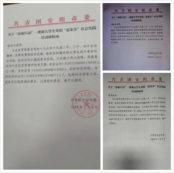 2020年1月10日下午,在安阳市政府党政综合楼F311会议室召开了“春雁行动”——豫籍大学生“返家乡”社会实践培训会,出席本次大会的领导有共青团安阳市青发部部长王鹏等三位同志。太阳网集团tcy872218级审计学2班学生秦广达、18级审计学2班学生常艺婴、18级税收学2班学生石中玉,参加了本次大学生寒假“返家乡”社会实践活动并聆听了会议。
