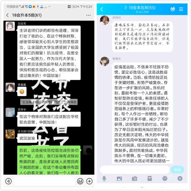 辅导员胡翔宇老师说:今天我们全国师生共同宅在家里,齐上一堂防疫思政大课,停课不停学,打赢人民战疫,这是是一堂深刻和难忘的思政课。疫情在全球的蔓延速度之快,威力之猛,使得世界不断聚焦中国防控疫情的成功经验,认为中国采取的最勇敢最灵活和最积极的严格防控措施有效遏制疫情的漫延,全国学校停课不停学,数百万学子每天通过直播软件上课,疫情下的许多行业仍然保持繁荣,疫情如令,责任如山,在这场众志成城,同仇敌忾的战斗中,中国人民的团结信念和责任感令世界印象深刻。疫情就是命令,防控就是责任。作为一名共产党员和高校思政工作者,我们应带头把疫情防控作为当前压倒一切的政治任务,带头服从学校一切防控的相关部署和要求。要把这次疫情当作是一种学习的机会,要学习在这次疫情只能中战斗的人们的舍己为人,乐于奉献的精神,树立正确的人生观,价值观。正确认识疫情,积极学习疫情和病毒的预防知识,在复工和开学之后要注意做好防范和保护措施。