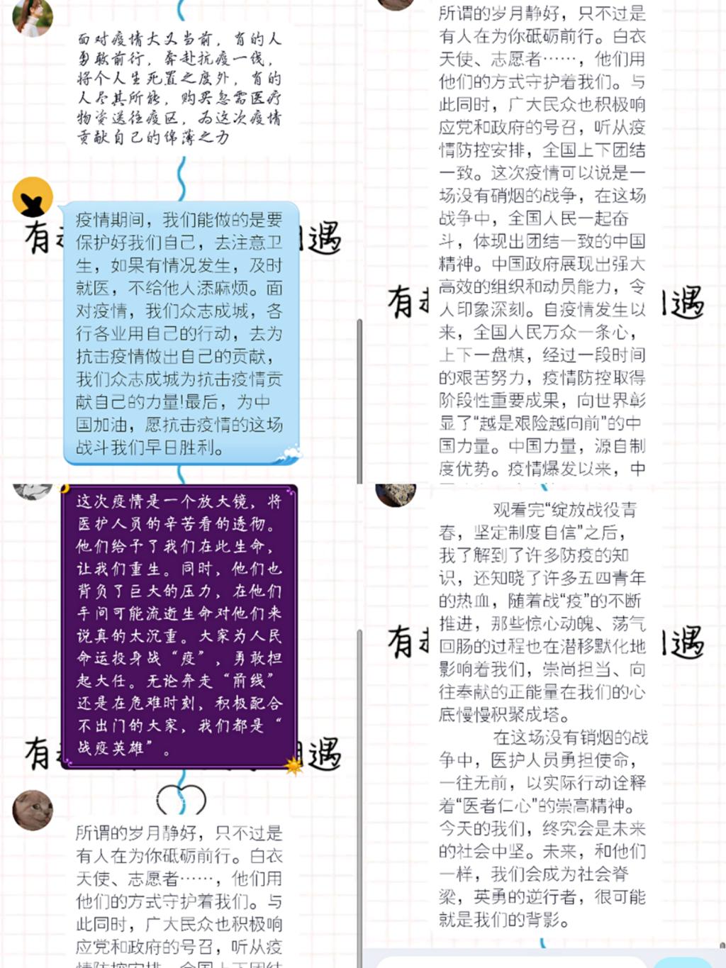 19会本2班秦震说:“百年前,青年们为了祖国的前途命运奔走呼喊,百年后,新冠肺炎疫情突如其来,无数中国青年挺身而出,奔赴战疫一线。自疫情防控战打响以来,无数的青年人在关键时刻站了出来,他们临危不乱、坚强勇敢,无畏无惧。在国家艰难困苦时纷纷请战,展现了青年人的担当。在这场没有硝烟的战争中,他们志愿战‘疫’,无条件服务于疫情防控需要,为坚决打赢疫情防控阻击战贡献了青春的力量。他们用青春热血,甚至年轻生命守护了我们,用行动展示使命与担当,书写了青春的篇章,以无私无畏的精神放射出年轻一代的荣光。”
