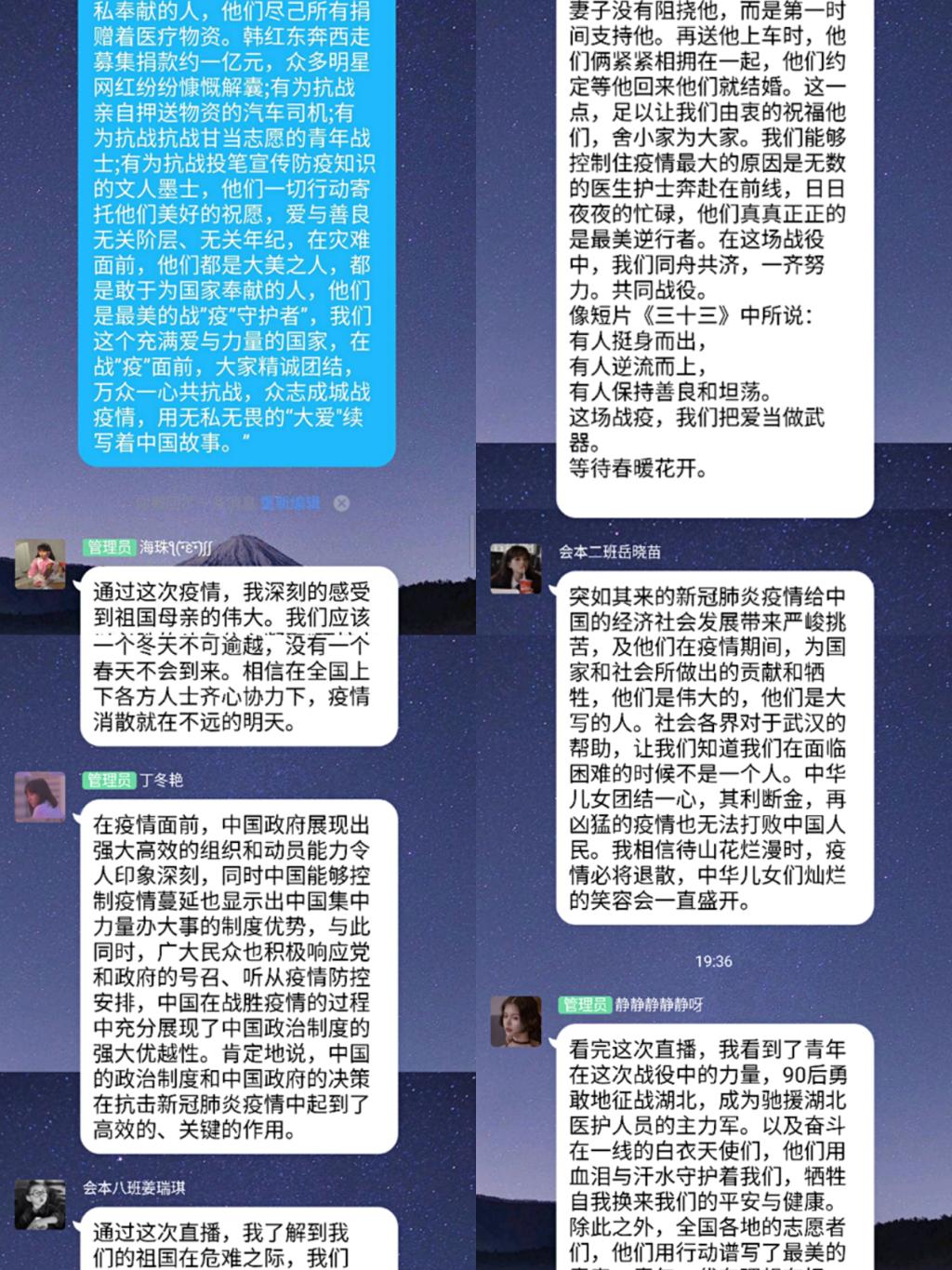 18会本1班张恒博:“通过这次直播,我了解到我们的祖国在危难之际,有一群无私奉献的人,他们尽己所有捐赠着医疗物资。韩红东奔西走募集捐款约一亿元,众多明星网红纷纷慷慨解囊;有为抗战亲自押送物资的汽车司机;有为抗战抗战甘当志愿的青年战士;有为抗战投笔宣传防疫知识的文人墨士,他们一切行动寄托他们美好的祝愿,爱与善良无关阶层、无关年纪,在灾难面前,他们都是大美之人,都是敢于为国家奉献的人,他们是最美的战”疫”守护者”,我们这个充满爱与力量的国家,在战”疫”面前,大家精诚团结,万众一心共抗战,众志成城战疫情,用无私无畏的“大爱"续写着中国故事。”