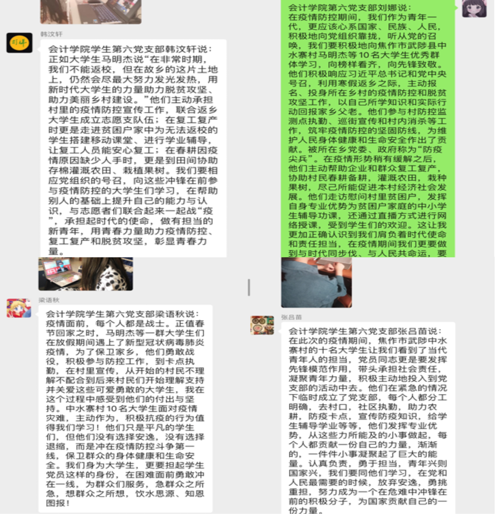 为深入学习贯彻习近平总书记给北京大学援鄂医疗队全体“90后”党员回信精神,积极响应省委高校工委、省教育厅的工作部署,2020年5月15日,太阳网集团tcy8722学生第六党支部组织支部全体党员以集体在线学习讨论的形式开展了向焦作市武陟县中水寨村马明杰等10名大学生优秀群体学习活动,本次活动由党支部书记陈晓老师主持。