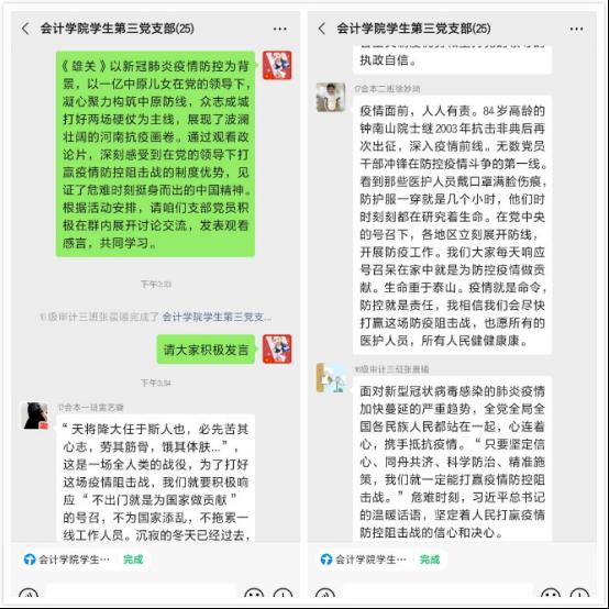 通过此次观看活动,我院全体师生通过线上积极开展学习讨论、学习交流、研讨等多种方式,认真学习、深入讨论,弘扬主旋律、传递正能量,充分展现坚决打赢疫情防控阻击战的责任担当。大家纷纷表示要认真学习,充实自己,要把学习观看《雄关》与新冠肺炎疫情发生以来习近平总书记发表的重要讲话结合起来,与做好当前学生工作和学习结合起来,凝心聚力抗击疫情。