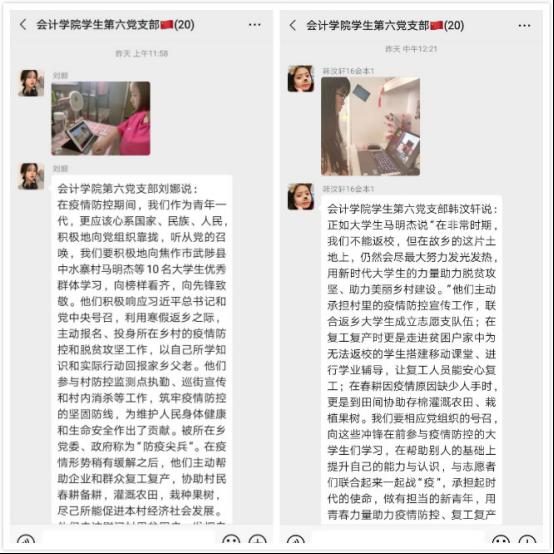 学生第七党支部书记刘爽说:党员,不仅是一个称呼,是一个身份,也是一份责任,更是一面旗帜。我们党员同志要不忘最初入党时的铮铮誓言,甘于“奉献”“牺牲”,疫情就是命令,防控就是责任,要时刻充分发挥党员干部先锋模范作用,关键时刻勇担党员同志的责任与担当。
