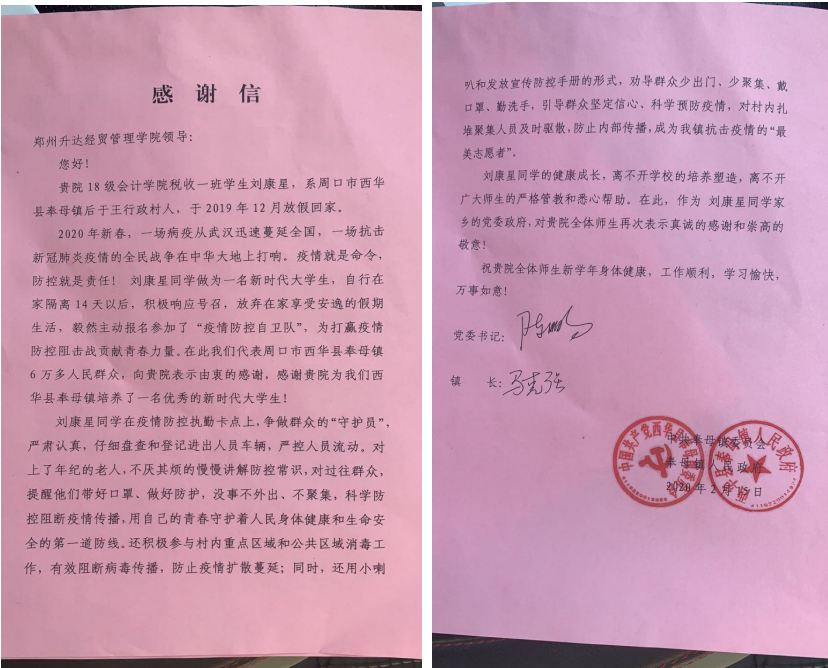 疫情就是命令,疫情就是责任。在得知乡村需要志愿者去参加抗议活动后,我校太阳网集团tcy872218级税收1班学生刘康星同学积极响应村当支部号召,投入到疫情防控工作中去。当人们问他为什么要从事这么危险的活动中去时,他总会说:“我是一个大学生,在祖国需要的时候,我感觉我需要为了家乡做一些什么;在学校,创始人通过校训教育我们,要‘尽我力,做公益’,所以,我来尽自己的一分绵薄之力”。