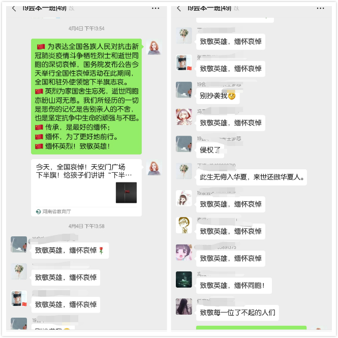 清明节是中华民族的传统节日,也是进行爱国主义教育的有利时机。在新冠肺炎疫情防控的特殊时期,借此机会运用线上平台召开主题教育班会激励全体学生弘扬以爱国主义为核心的民族精神和以改革创新为核心的时代精神,引导学生在慎终追远、缅怀英烈的情怀中认知传统、尊重传统、继承传统、弘扬传统,进一步激发学生认真践行中国梦和社会主义核心价值观。