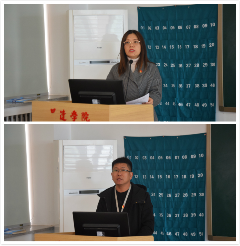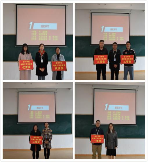 大会第一项,颁奖仪式。刘锦老师为获得优秀奖的蔡艳丽老师、郑杰老师进行颁奖并合影留念,陈刚老师为三等奖的郑文杰老师、杨煜老师进行颁奖并合影留念,张蕾书记为获得二等奖的刘叶青老师进行颁奖并合影留念,最后,由张欣院长为获得一等奖的许震老师进行颁奖并合影留念。
