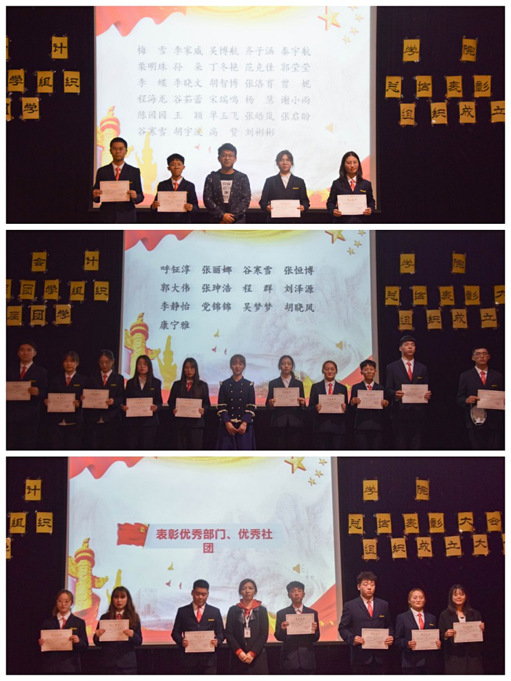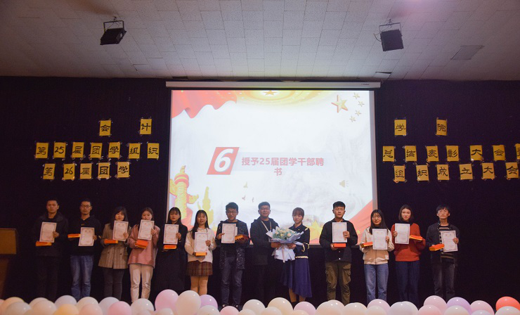 紧接着,进行了激动人心的颁奖环节。由第25届社联理事长姜大川,团委副书记巫晓梦,刘锦老师分别为优秀副部长和副队长,优秀部长和社长,优秀部门、社团颁奖并合影留念,由陈刚老师为第25届团学干部颁发聘书及奖状。