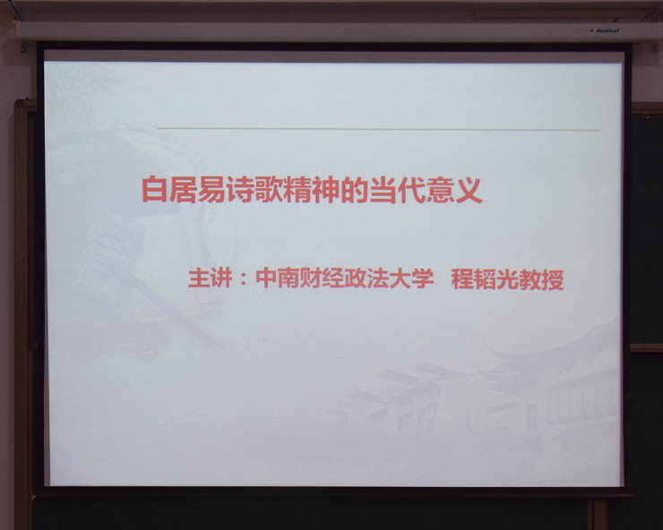 程韬光教授凭着深厚的文学修养和功底,给同学们详细介绍了著名诗人白居易。首先,程教授向同学们讲述了白居易的人生。程教授将白居易的一生分为六个阶段,分别为出生乱世、仕官生活、贬谪江州、任职苏杭、晚年生活、洛阳安逝。接着,程教授向同学们介绍了白居易精神的要义,即爱民精神、担当精神、包容精神、贞刚精神。最后,程教授与同学们分享了白居易诗歌精神的当代意义。程教授强调白居易诗歌中强烈的文化自信,正是当代大学生身上所需要具备的文化标志。