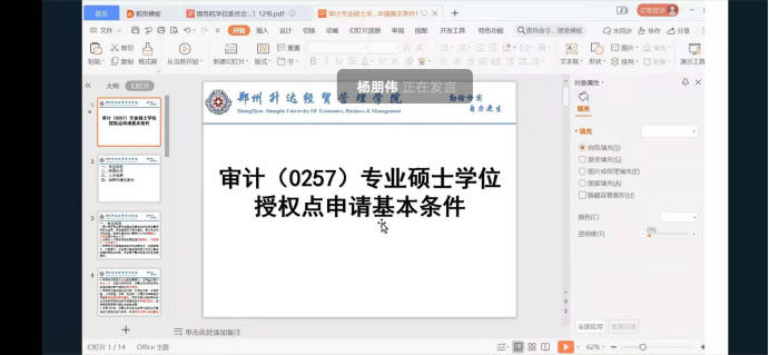 杨朋伟老师进行了《审计专业硕士学位授权点申请基本条件》的解读。杨老师从专业特色、师资队伍、人才培养、培养环境与条件四个大的方面全面解读了申请基本条件。