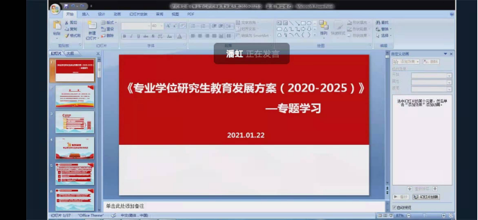 随后,王瑞云老师带领大家学习了《专业学位研究生教育发展方案(2020-2025)》,主要内容为:专业学位研究生教育成就与挑战,《方案》发展与目标、着力优化硕士学位研究生教育结构、加快发展博士学位研究生教育、大力提升学位研究生教育质量、《方案》组织与实施六个方面。