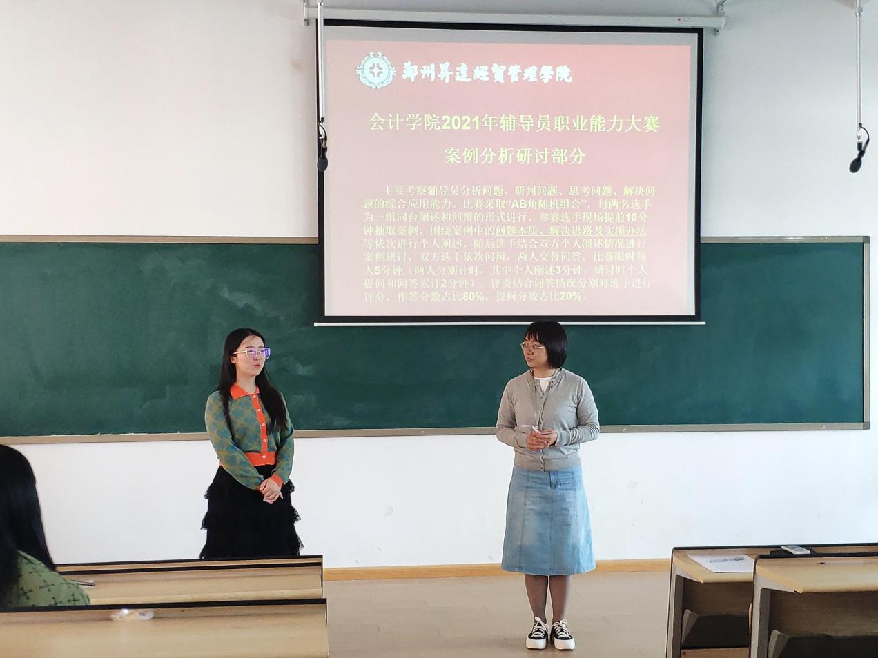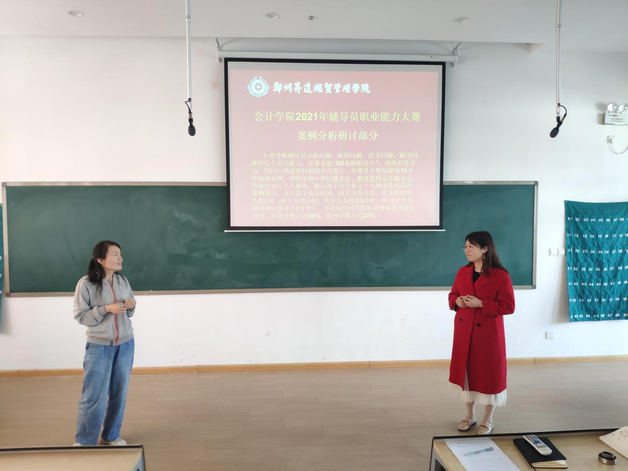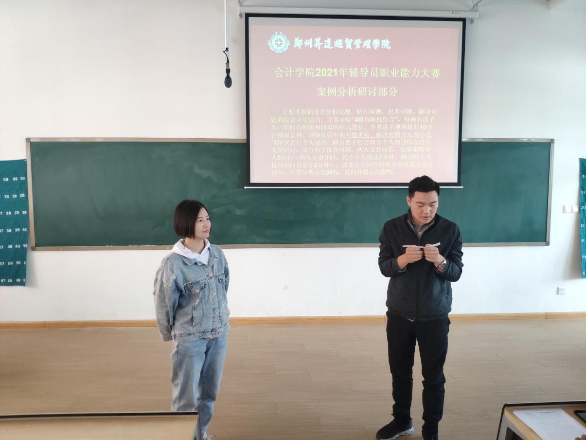 第二阶段为案例分析研讨环节,主要考察辅导老师们研判问题、解决问题的能力,对相关理论政策、学生特征、学生成长成才规律的了解和把握以及对问题的解决能力和对学生的教育引导能力。辅导员老师们根据所抽选题目采取“AB角随机组合”,每两名选手为一组同台阐述和问辩的形式进行,围绕案例中的问题本质、解决思路及实施办法等依次进行个人阐述,随后选手结合双方个人阐述情况进行案例研讨,双方选手依次问辩,两人交替问答。
