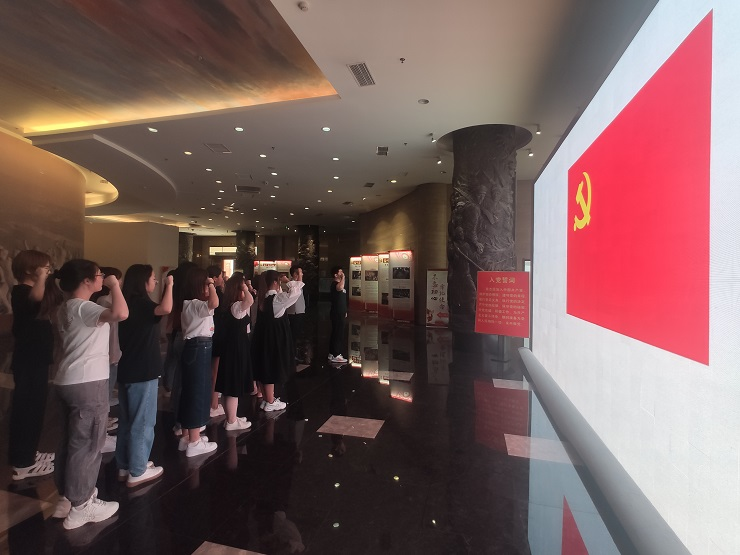 参观结束后,党员同志们在馆内党旗前重温入党誓词,鲜艳的党旗昭示着新时代的曙光、铿锵有力的誓词彰显了同志们时刻牢记革命先辈历史功勋的诚心和争做新时代合格党员的决心。