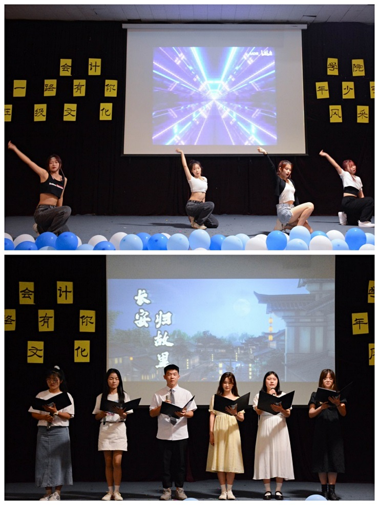 本场晚会分为上下两场,上半场为“展青春之风”,下半场为“亮活力之彩”。上半场“展青春之风”由18级会本4班,20级财管3班、会专2班和会本5班等选送的开场舞蹈《咆哮+gashina》拉开序幕,调动起了现场的气氛,给观众们带来了视觉与听觉上的震撼。接下来是由19级会本10班选送的歌曲《嘉宾》,开启了全场的大合唱;由20级会本2班,会专3班和会专6班带来的《追梦青春》,将观众带回了那段热情澎湃的青春时光;由20级会专1班以及会专7班带来的说唱《星球坠落》,让同学们感受到歌词中爱情的甜蜜;舞蹈《Yes,OK!》动感的舞姿和节奏展现了会计学子的青春活力与魅力,使全场气氛达到高潮;最后以太阳网集团tcy8722演讲队带来的朗诵《长安归故里》结束了上半场的篇章。