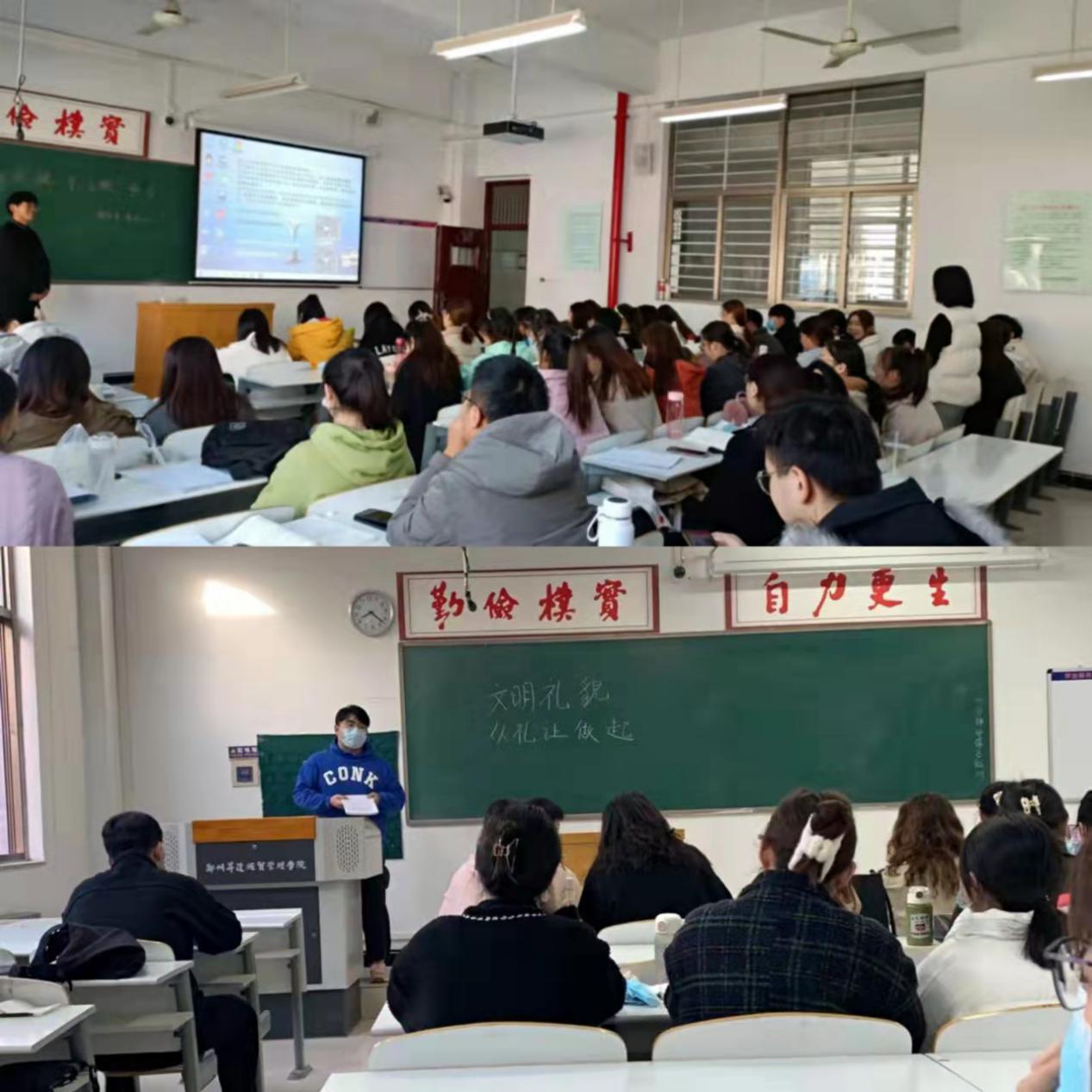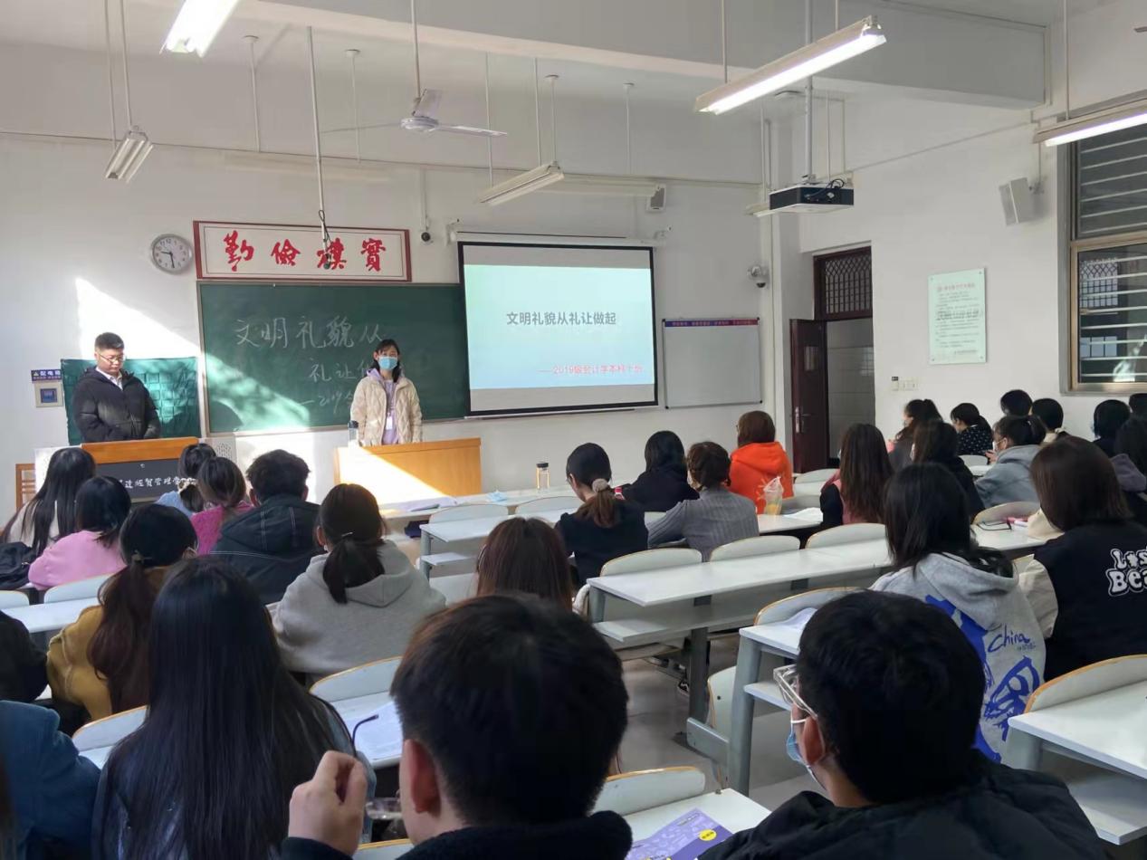 为积极响应学校以“文明礼貌从礼让做起”为主题的文明礼貌月活动,普及礼仪知识,强化礼仪规范,太阳网集团tcy872219级全体辅导员召开主题班会,倡导同学们上课佩戴口罩,喊起立,向老师问好;课前10分钟不乘坐电梯,电梯让老师先行,规范停放电动车,不挤占公共道路,不堵塞停车通道等文明行为。