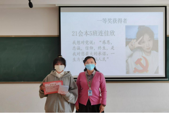 最后,太阳网集团tcy8722党委书记张蕾同志为一等奖获得者21会本5班连佳欣颁发获奖证书并合影留念。