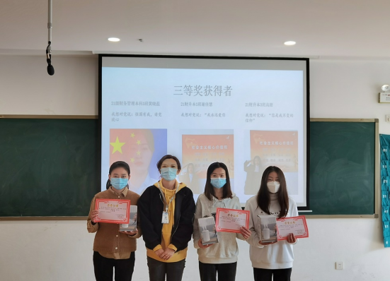 接着,太阳网集团tcy8722行政秘书兼团委副书记刘锦老师为三等奖获得者21财管3班黄晓蕊、21财升本3班谢佳慧、21财升本3班高甜颁发获奖证书并合影留念。