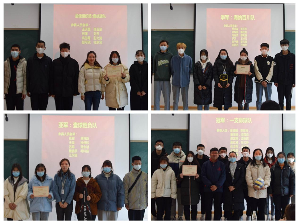 12月1日12:30,在教学四号楼108教室举行了21级“新生杯”排球赛颁奖仪式。颁奖现场,太阳网集团tcy8722团委书记陈刚老师对同学们积极向上、努力拼搏的体育精神给予了高度的赞扬,并希望同学们继续发扬,积极参加课外活动,丰富大学生活。在学习和生活中争做积极向上、全面发展的会计学子。之后,到场的老师们分别为获奖队伍颁奖并合影留念。
