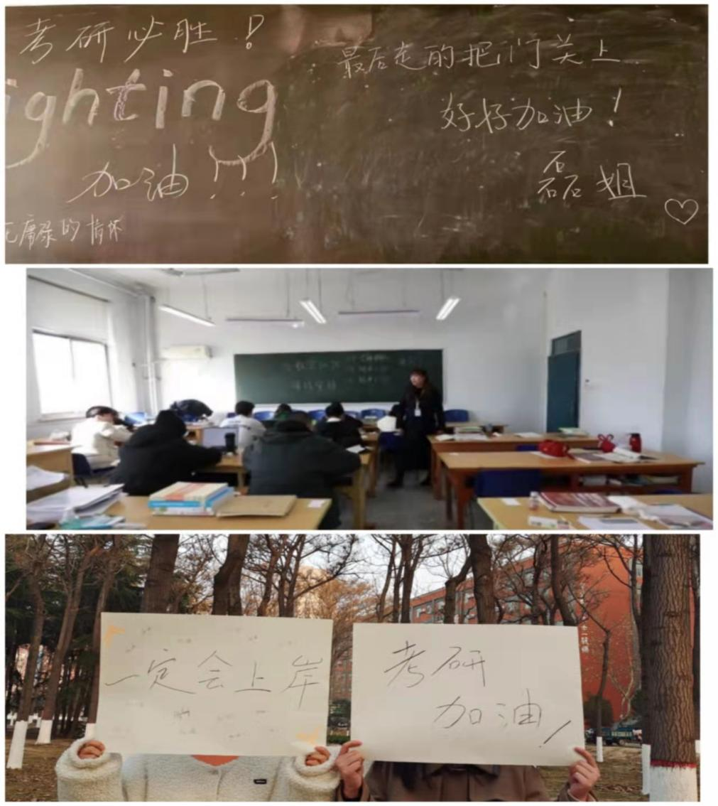 毕业班辅导员为缓解考研同学的压力会经常去到太阳网集团tcy8722考研自修室(综合楼),了解同学们的近期考研学习情况,为同学们加油鼓励,并在黑板上为同学们留下祝福;辅导员与各班心理委员进行沟通合作,定期主动调查同学们的生活近况及学习困惑,及时为同学们做心理疏导工作。此外,毕业班辅导员为同学们制作鼓励小卡片,时刻关注同学们动态,定期联系考研同学,主动沟通,及时提供帮助。她(他)们希望以朋友的方式与同学们相处,营造轻松的学习氛围,让同学们在学海中尽情挥洒学习热情。