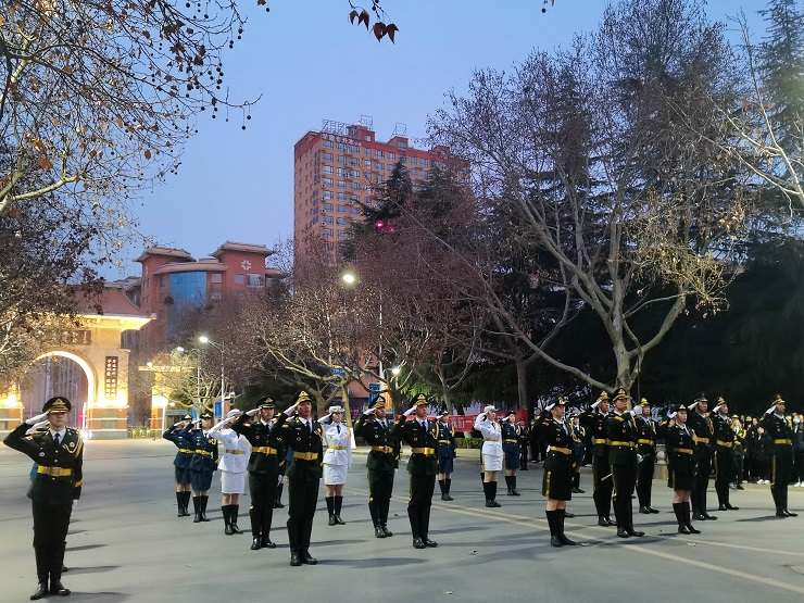 迎着清晨的第一缕阳光,国旗护卫队身着正装,迈着整齐划一、铿锵有力的步伐,护卫着国旗走上升旗台。伴随着国歌奏起,全体师生庄严地向五星红旗行注目礼。