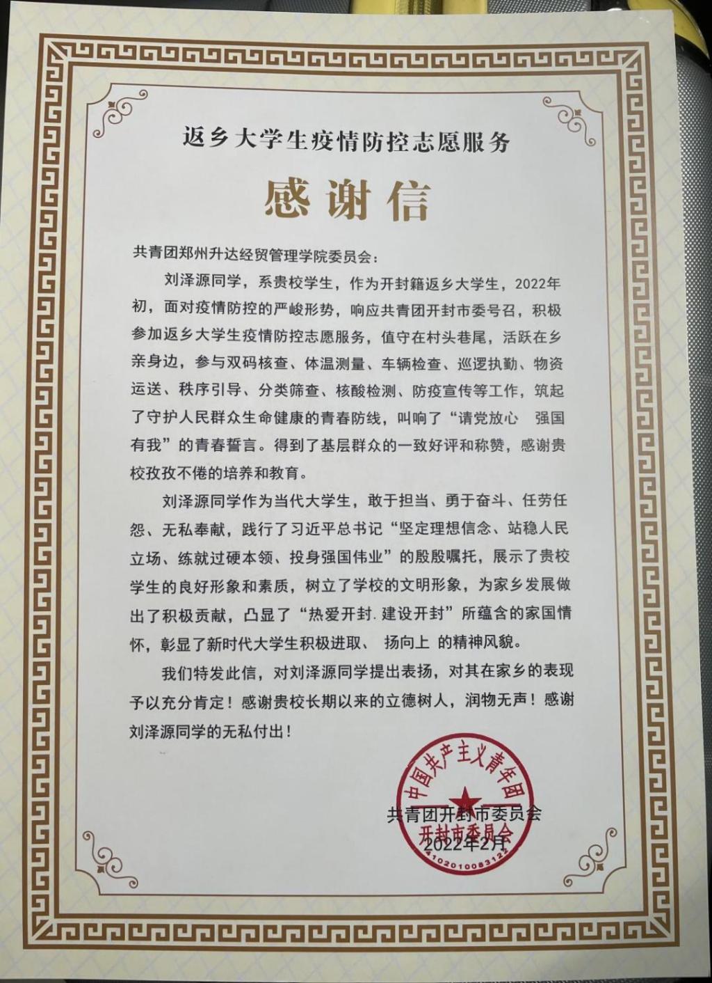 优等的心,不必华丽,但必须坚固。作为志愿者,作为新时代青年,作为学生干部,为社会做贡献,为他人提供帮助,是他们的追求与夙愿。作为开封市民,参与家乡建设,参与家乡疫情防控是他们的责任与担当。3月14日,辅导员路飞龙老师收到了共青团开封市委员会的实名感谢信,一同邮寄的还有有共青团开封市委员会表彰评选的返乡学子优秀志愿者荣誉证书。信中高度肯定了作为志愿者其表现的时代使命与责任担当,同时对我校立德树人的办学理念给予肯定和感谢。