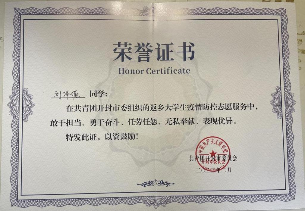 在开封市疫情防控小组中,刘泽源与马聪同学,始终以开封市疫情防控小组指示为行动准则,扎根疫情防控卡点,测量进出小区人员体温,登记出入车辆,检查外来人员双码,协同社区对中高风险地区返市人员进行登记、隔离,协同运送龙亭区疫情防控物资到位,向过往居民宣传疫情防控指导手册。可谓尽职尽,为开封市疫情防控工作贡献出了自己的一份力量。