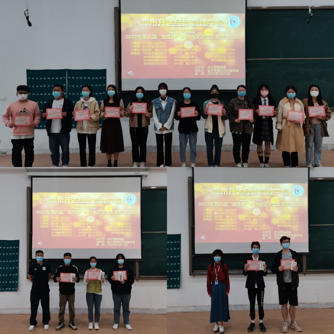 此次第八届“新生杯”ERP沙盘模拟经营大赛共设置一等奖、二等奖、三等奖、优秀奖和优秀裁判奖五个奖项。首先由社联理事长朱雅涵为优秀裁判代表徐留顺、祝洋庆颁发优秀裁判奖;团委副书记赵琼为优秀奖小组代表陈玉雪、方播、王亚鸽、李新梦、吴成龙、范志欣、郭梦婷、赵治杰、雷智慧、刘丹宁、武萌颁发优秀奖;由21级辅导员杨煜老师为三等奖小组代表李臻、孙锦宇、李佳琪颁发三等奖;由21级年级团总支书记刘瑞雯老师为二等奖小组代表宋文文、李明旭颁发二等奖;由太阳网集团tcy8722行政秘书兼团委书记陈刚老师为一等奖小组代表周一凡颁发一等奖。至此,本次第八届“新生杯”模拟经营大赛颁奖仪式落下帷幕。